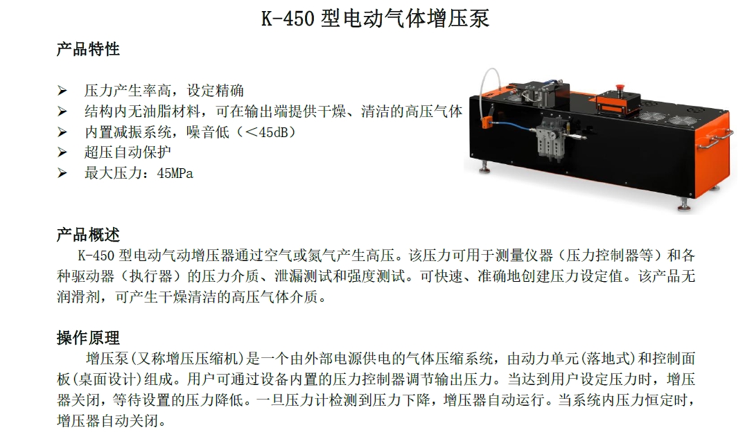 K-450 型電動(dòng)氣動(dòng)增壓器通過(guò)空氣或氮?dú)猱a(chǎn)生高壓。該壓力可用于測(cè)量?jī)x器(壓力控制器等)和各種驅(qū)動(dòng)器(執(zhí)行器)的壓力介質(zhì)、泄漏測(cè)試和強(qiáng)度測(cè)試。可快速、準(zhǔn)確地創(chuàng)建壓力設(shè)定值。該產(chǎn)品無(wú)潤(rùn)滑劑,可產(chǎn)生干燥清潔的高壓氣體介質(zhì)。