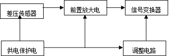 擴(kuò)散硅差壓變送器工作原理為:過(guò)程壓力作用在傳感器上,傳感器即輸出與壓力成正比的電壓信號(hào),電壓信號(hào)通過(guò)放大電路轉(zhuǎn)化為4—20mA標(biāo)準(zhǔn)信號(hào)。其供電保護(hù)電路為傳感器提供激勵(lì),此傳感器采用了精密溫度補(bǔ)償電路。其工作原理框圖如下:
