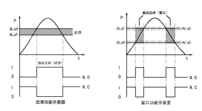 該功能可用于監(jiān)控特定的區(qū)間,其輸出可用來(lái)完成控制、報(bào)警等工作,且只需一個(gè)輸出點(diǎn)。如右圖所示,以常開(kāi)型(N.O)為例,灰色帶為窗口值(ALxF -ALxH);當(dāng)壓力值處于窗口之間時(shí),開(kāi)關(guān)點(diǎn)才吸合;而當(dāng)壓力值超出該區(qū)間時(shí),開(kāi)關(guān)點(diǎn)斷開(kāi)。