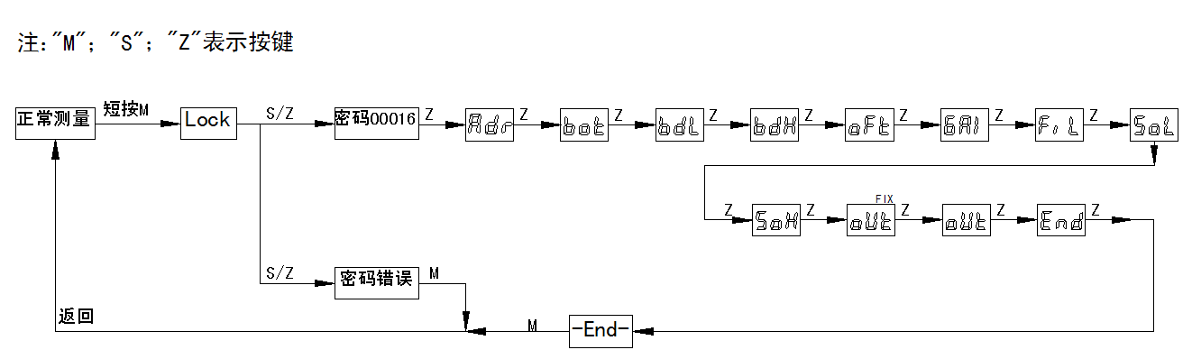 在正常測量模式下,短按M鍵提示輸入密碼??梢赃M(jìn)入下面所列菜單。用戶密碼為0016.